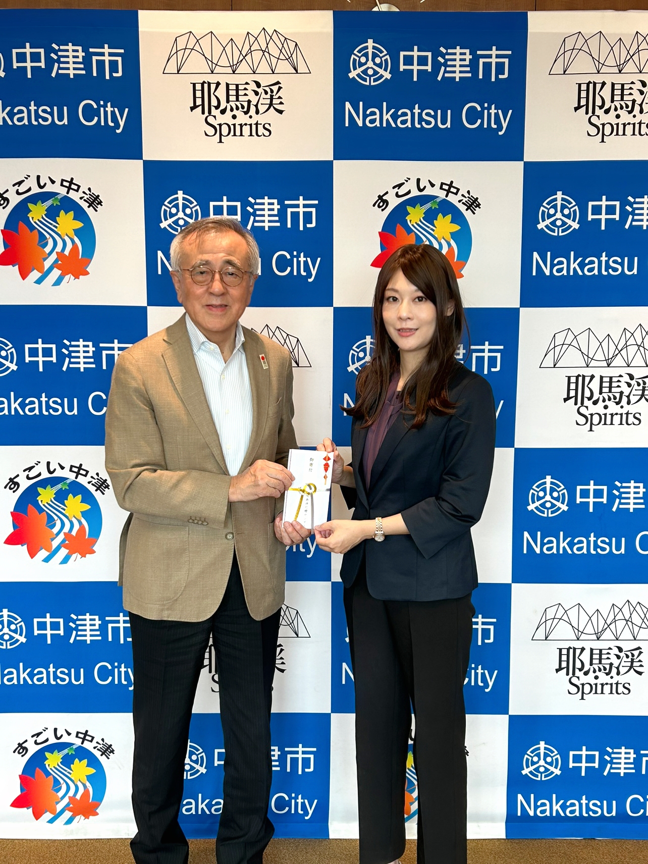 このたび、日ごろのご支援への感謝の気持ちを形にするものとして、中津市へ10万円の寄付を行いました。今回の寄付金は、防犯対策として街灯設置などの安全対策に活用していただく予定です。